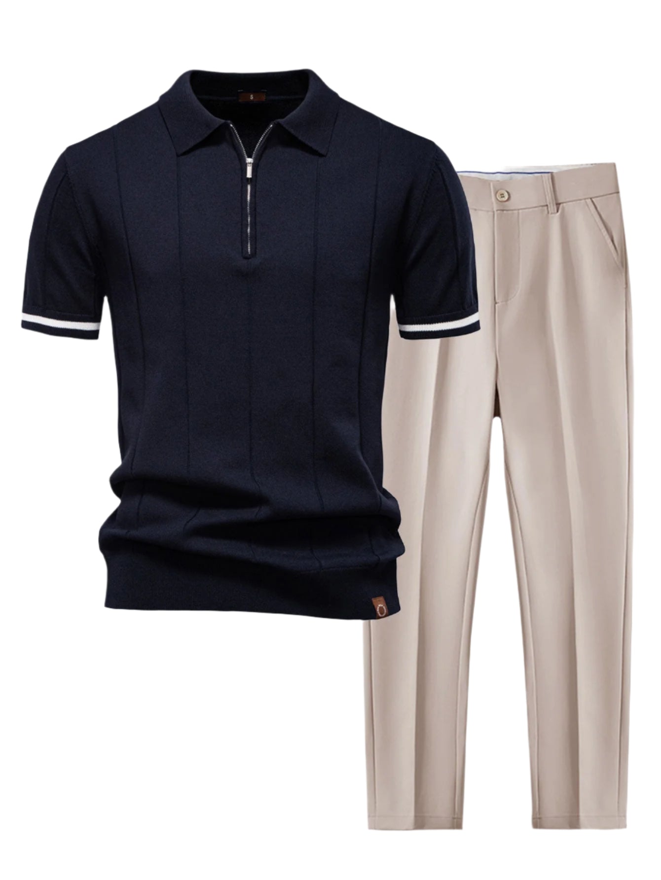 Contrast Trim Zipper Knit Polo Shirt & Slim Fit Tapered Trousers