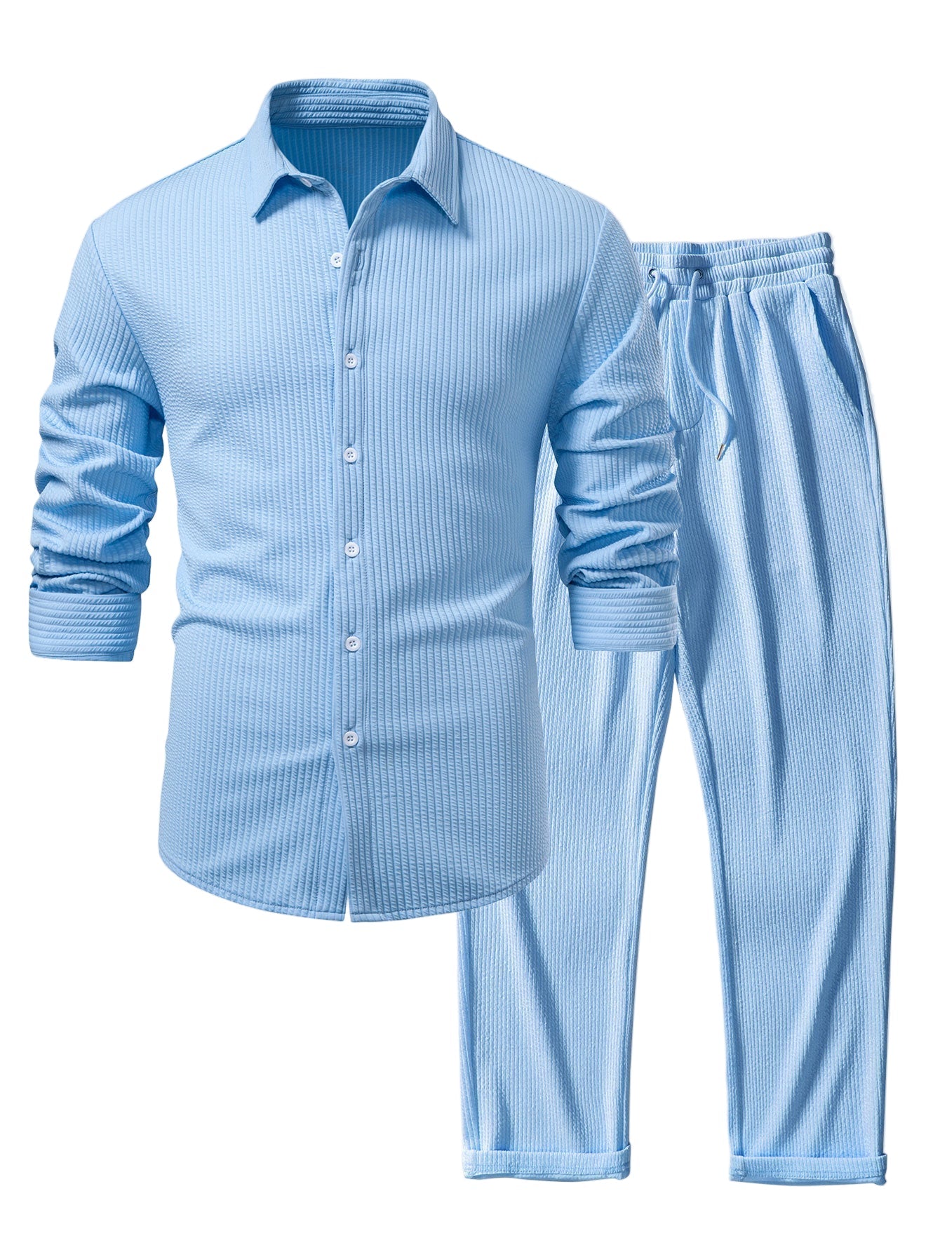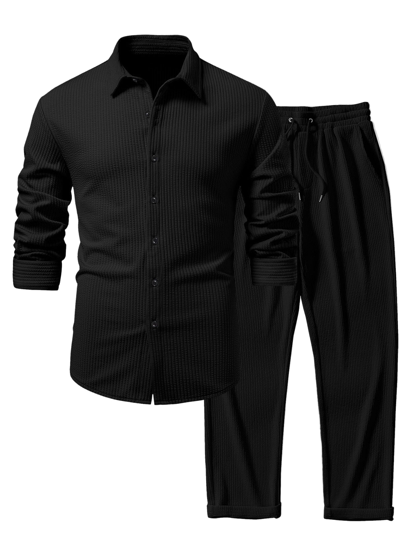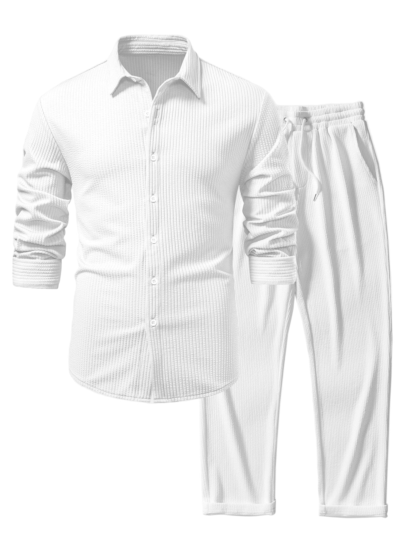 Long Sleeve Muscle Fit Ribbed Button Up Shirt & Straight Leg Ribbed Pants