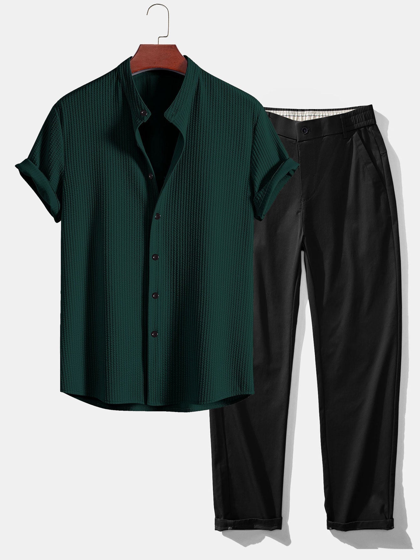 Muscle Fit Ribbed Stand Collar Shirt & Elastic Waist Straight Leg Trousers